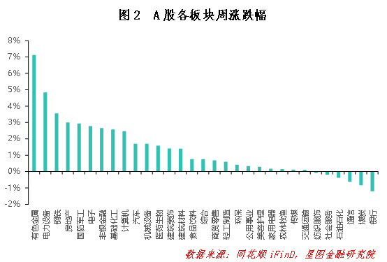 从申万一级行业来看,周内7个一级板块上涨,行业之间分化极为显著。涨幅靠前的聚集在有色金属、电力设备、钢铁等领域。主要是美联储降息预期开始向实物资产反应。跌幅较大的则包括银行、煤炭、通信等,主要还是避险情绪上升,前期红利行情出现退潮与回调。更多数板块当周表现都要强于前周,25个板块涨幅扩大或者跌幅收窄。整体来看,当周行情不错。
