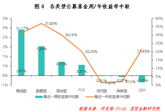 周内基金收益率中枢表现分化,商品型表现最佳,周收益率中枢达到2.41%,主要是因此黄金价格飙升突破。由于A股上涨,股票型和混合型基金同样表现不错。值得注意的是,QDII型基金周收益率中枢为-0.35%,债券型基金周收益率中枢为-0.07%,与基金指数差异较大,说明两种类型基金内部分化较为严重。从年收益率中枢来看,绝大部分基金类型收益率中枢都在下行,只有商品型、债券型还在上升。股票型、混合型基金年收益率中枢较上周大跌11.13pct、8.87pct,极为突出,可能是因为去年 “924行情”的影响,商品型基金年收益率中枢已经超过混合型基金,仅次于股票型基金。