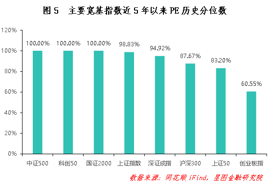 从近5年以来分位值来看,指数估值依然处于相对高位,比如中证500、科创50、国证2000都达到100%分位数,这意味着其已经比过去5年所有时间都要更贵。而且,上证指数、深证成指分位数都超过90%,沪深300、上证50分位数都超过80%,目前仅有创业板指分位数为60.55%,在所有宽基指数中处于相对低位,不过近来已经出现明显的补涨行情。总体上看,A股经过反弹,重新回到估值高位,深市空间大于沪市,后续涨幅可能要取决于基本面的改善。