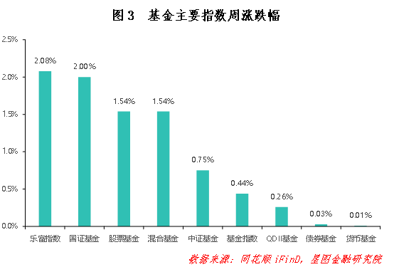 周内各大基金指数普遍上涨,主要受资本市场走牛影响。由于周内A股持续涨,股票型和混合型基金均上涨1.54%。海外市场同样上涨,不过显然逊色于A股,叠加交易日影响,QDII型基金仅小幅上涨0.26%。债市表现不错,债券型和货币型基金分贝上涨0.03%和0.01%,整体而言处于正常水平。由于深市表现好于沪市,因此乐富指数等深系基指表现明显好于基金指数等沪系基指。