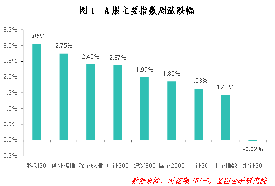 周内A股集体收涨,8大指数全线上行,市场上赚钱效应不错。从市场风格上看,中盘股表现最好,中证500大涨2.37%,大小盘表现趋于一致,沪深300、国证2000、上证50分别上涨1.99%、1.86%、1.63%。成长表现明显好于价值,科创50和创业板指分别上涨3.06%和2.75%,均要优于价值风格占主流的上证50和沪深300。