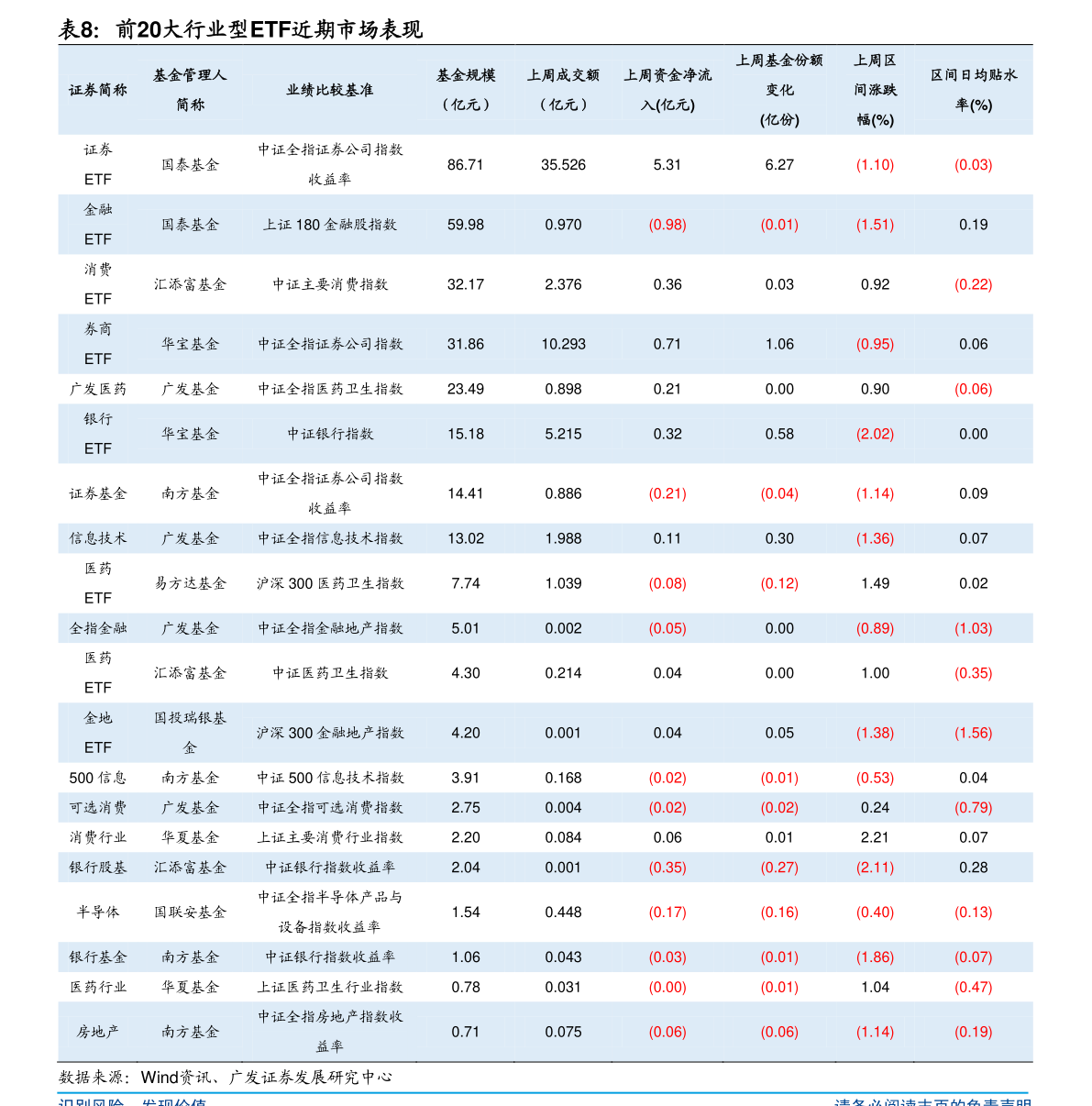 风险提示:数据来自过往公开历史信息,和资产历史表现,在市场变动下可能失效概况截止2020年12月11日,宽基指数ETF总规模为3554.50亿,本周资金净流入为19.48亿,行业ETF总规模为1431.82亿,本周资金净流入为31.26亿,主题ETF总规模为1911.18亿,本周资金净流入为-24.25亿。