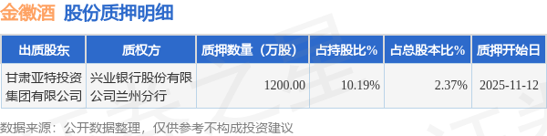2025-11-15今日股市,股票推荐,大盘走势分析,股市资讯,股票入门,短线炒股/为广大股民提供及时准确的股市行情分析、热点股票推荐、最新利好政策解读与炒股实战经验,帮助你把握投资先机、实现财富增长!证券之星消息,金徽酒(603919)11月13日公开信息显示,股东甘肃亚特投资集团有限公司向兴业银行股份有限公司兰州分行合计质押1200.0万股,占总股本2.37%。质押详情见下表: