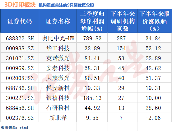 Wind数据显示,目前A股3D打印板块共有22只概念股,其中机构重点关注的绩优股有9只,分别是奥比中光-UW、华工科技、英诺激光、安泰科技、大族激光、悦安新材、银禧科技、有研粉材、新北洋。
