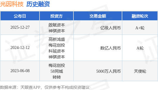 2025-12-31今日股市,股票推荐,大盘走势分析,股市资讯,股票入门,短线炒股/为广大股民提供及时准确的股市行情分析、热点股票推荐、最新利好政策解读与炒股实战经验,帮助你把握投资先机、实现财富增长!证券之星消息,根据天眼查APP于12月27日公布的信息整理,深圳市光因科技有限公司A+轮融资,融资额亿级人民币,参与投资的机构包括啟赋资本,神骐资本。