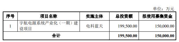 公司最终募集资金净额比原计划多7916.14万元。电科蓝天2026年2月5日发布的首次公开发行股票并在科创板上市招股说明书显示,公司拟募集资金150,000.00万元,用于宇航电源系统产业化(一期)建设项目。
