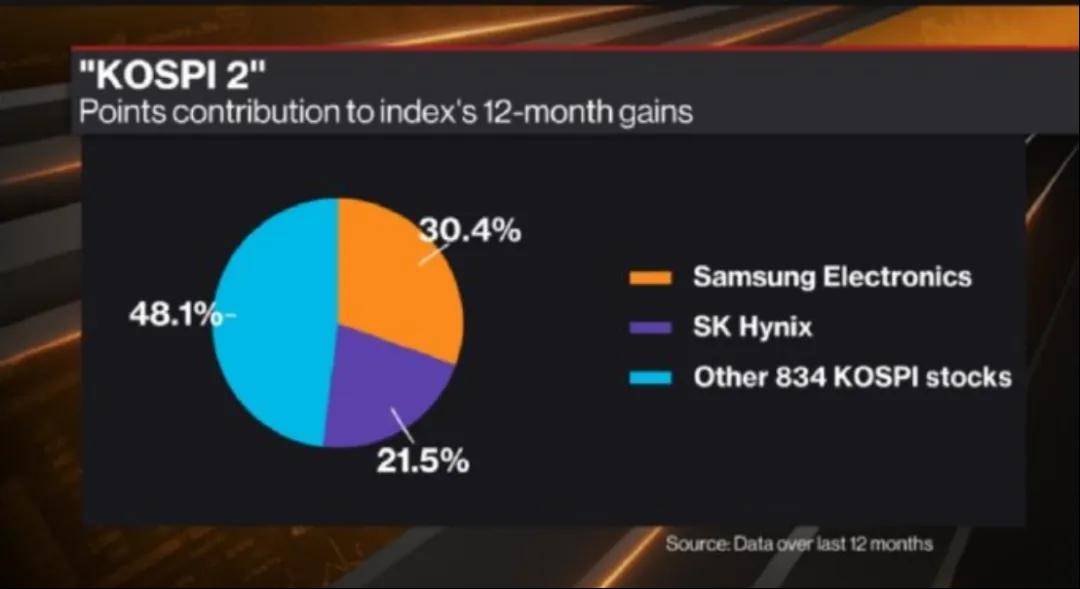 它的成分股包括三星电子和海力士两家国际半导体头部企业,过去十二个月,两只股票贡献了韩国股市51%的涨幅。