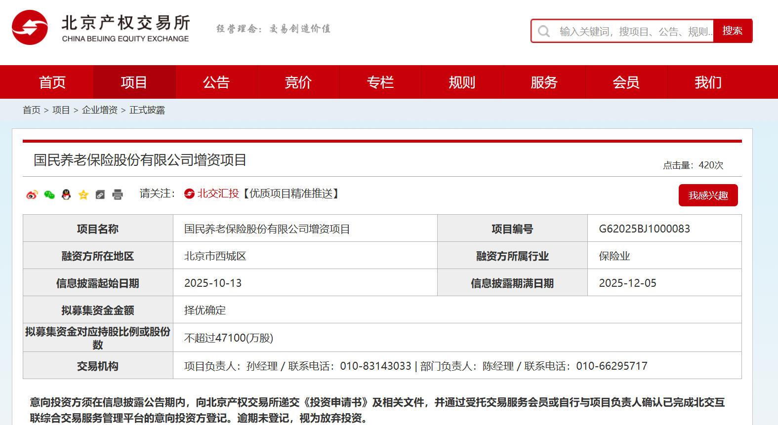 2025-10-15今日股市,股票推荐,大盘走势分析,股市资讯,股票入门,短线炒股/为广大股民提供及时准确的股市行情分析、热点股票推荐、最新利好政策解读与炒股实战经验,帮助你把握投资先机、实现财富增长!引入新投资者不足一年,近日,国民养老保险股份有限公司(下称“国民养老保险”)又在北京产权交易所网站挂牌披露增资扩股项目,计划发行不超过4.71亿股,征集不超过5家投资方,募资用于补充核心一级资本,支持主业发展。现有股东不参与此次增资。