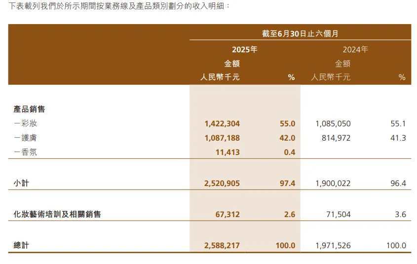 毛戈平发布2025年中期报告显示,2025年1-6月,公司实现营业收入25.88亿元,同比增长31.28%;净利润为6.7亿元,同比增长了36.11%。其中,彩妆作为毛戈平的核心业务,营收为14.22亿元,同比增长31.06%,营收占比为55%。渠道方面,2025年上半年,毛戈平线%;线%。