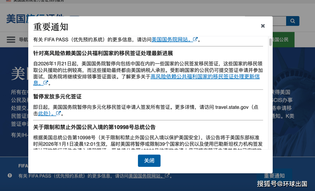 USTravelDocs 官网弹窗误将中国列入美国移民签证受限名单,引发市场高度关注与客户焦虑。环球出国美国团队第一时间核查确认:美国国务院 2 月 2 日最新官方清单不含中国,1 月 21 日后仍有中国籍申请人成功获签。2 月 11 日,该网站已删除错误提示,警报正式解除。